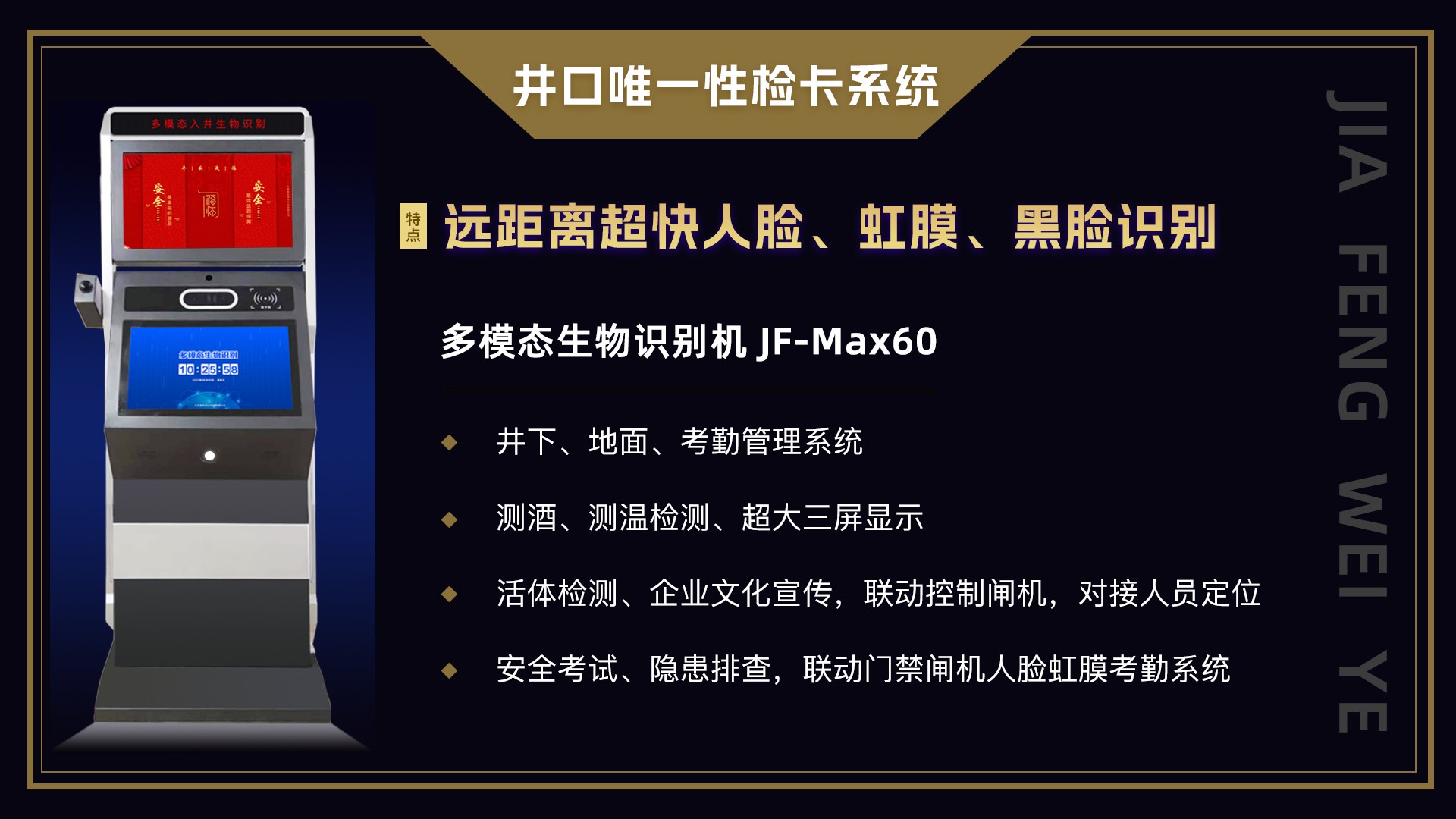在展会现场,嘉丰伟业的虹膜识别机器吸引了众多行业专家和企业代表的目光。他们纷纷驻足观看,对机器的识别速度和准确性表示赞赏。同时,技术人员也积极向参观者介绍产品的特点和优势,以及其在煤炭行业的应用前景。还展示了公司主要产品,包括井口唯一性检卡系统、多模态虹膜考勤系统、矿用考勤系统、AI识别系统、人力资源管理系统、资产管理系统、考试培训系统、矿用工资管理系统等煤矿专用系统。公司自主研发了虹膜考勤机、人脸考勤机、地面变电所巡检机器人(轮式)、井下中央变电所、泵房巡检机器人(轮式)。这些产品拥用自主的知识产权、专利,可以为用户更好的服务及定制功能。嘉丰伟业的虹膜识别机器不仅可用于井口检卡系统,还可广泛应用于煤矿安全生产、人员管理、物资管理等多个领域。通过与其他智能设备的联动,可以实现对煤矿生产全过程的智能化管理和监控,提高生产效率,降低安全风险。